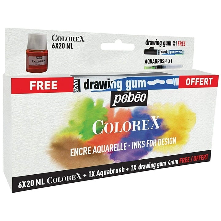 Tinte Colorex branda Pebeo su visoko kvalitetne tekuće akvarel boje, pogodne za dizajnere, ilustratore i grafičke radove. Akvarel tinta je odmah spremna za upotrebu. Možete je nanijeti kistom, akvarel olovkom ili airbrush pištoljem i pogodno je za površine kao što su akvarel papir, umjetnički papir, karton ili platno. Da biste postigli živopisne boje, možete ga koristiti izravno iz boce, ako želite da postignete tipičnu transparentnost akvarelnih boja, potrebno je razblažiti vodom. Boje se suše do baršunaste površine u roku od nekoliko minuta. Ako želite da maskirate neke dijelove rada, koristite gumu ili maskirnu tekućinu.
