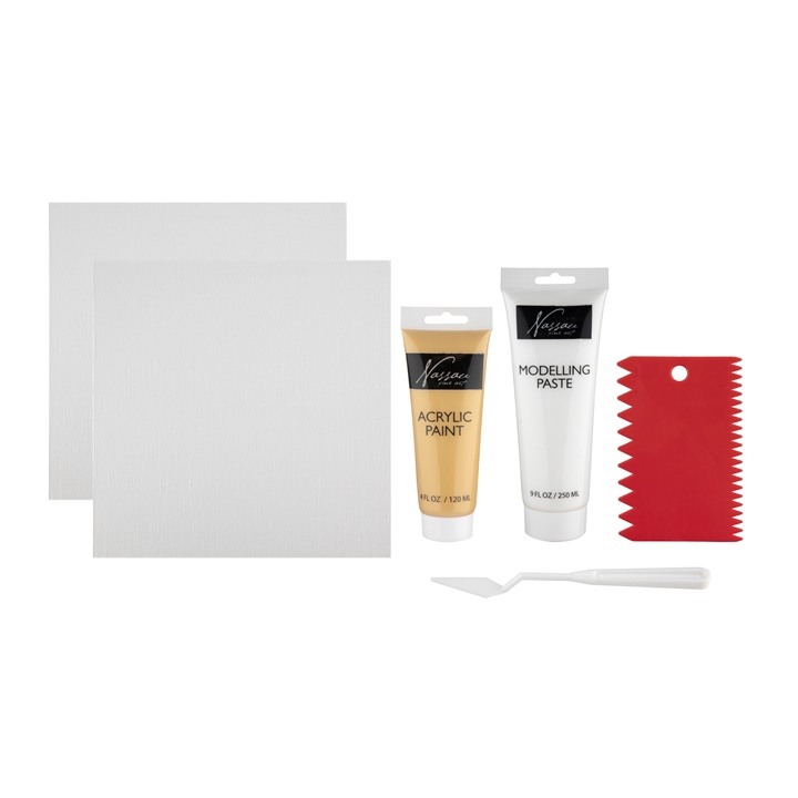 Sada na modelovanie Nassau obsahuje sve potrebne na tvorbu trojrozmerných umeleckých diel. Je navrhnutá pre umelcov všetkých úrovní , od začiatočníkov po profesionálov, ktorí chcú eksperimentovať s rôznymi technikami a materiálmi. vytváranie textúr a reliéfov na rôznych povrchoch a súčasťou sady je aj zlatá akrylová farba , ktorá dodá vaš dielam luxusný a žiarivý vzhľad. Pre precíznu prácu sú v sete zahrnuté aj špachtľa a stierka, ktoré umožňujú detailné tvarovanie a nanášanie pasty či farby. Ta modelovacia súprava je idealna za sve, ktorí chcú rozšíriť svoje umelecké zručnosti i objaviť nove tehnike.