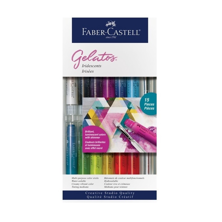 Pasteli Gelatos marke Faber-Castell će vašem djelu dati živopisan sjaj i možete ih koristiti sa ili bez vode. Kremaste boje su idealne za klasično crtanje. Svjetlucava paleta daje predivne nijanse, koje su bez mirisa i bez kiselina. Boje se lako miješaju i tako daju beskonačno mnogo novih tonova. Vrlo lako klize po površini i zato se mogu koristitii na različitim površinama poput papira sa strukturom, traka, platna, drveta, tekstila.