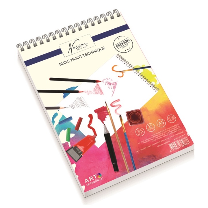 Blok papira Mixed Media brand Nassau Fine Art je blok za skiciranje sa prirodnim bijelim papirom i idealan je za mnoge umjetničke tehnike, zato je i dobio ime Mixed Media. Ovaj blok za crtanje sadrži papir glatke površinske strukture i gramaže 300 g/m2. Sadrži 25 listova papira koji su povezani spiralom i lako se okreću. zahvaljujući ovoj spirali, blok možete postaviti kako vama odgovara. Blok za Mixed Media zahvaljujući univerzalnom papiru može se koristiti za različite tehnike, tako da na samo jednom listu možete primjeniti više vrsta boja i medija od jednom. Slikanje, skiciranje, crtanje, kaligrafija, manga crtanje ili crtanje stripova - sve to skupa.