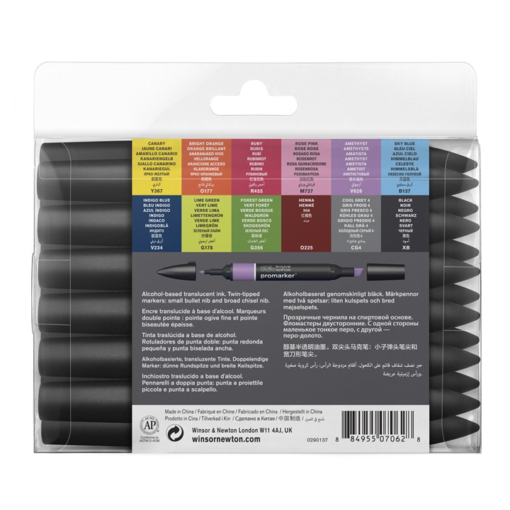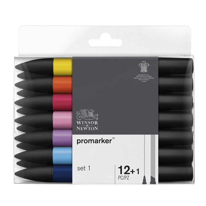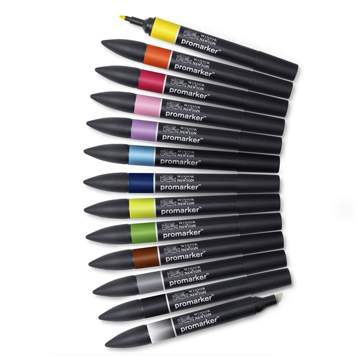 Set dvostranih umjetničkih markera Promaker branda Winsor & Newton predstavlja omiljeni pribor dizajnera, ilustratora, studenata, arhitekata i dr. Promarker je specifičan po tome što ima vrhove s obe strane. Jedan je širok i kratak, za veće površine, a drugi tanak i okrugao za sitnije delikatne detalje. Odgovarajući su za različite površine kao što je papir, staklo, plastika, keramika i druge. Ovaj set sadrži 12 osnovnih boja iz palete Promarkera.